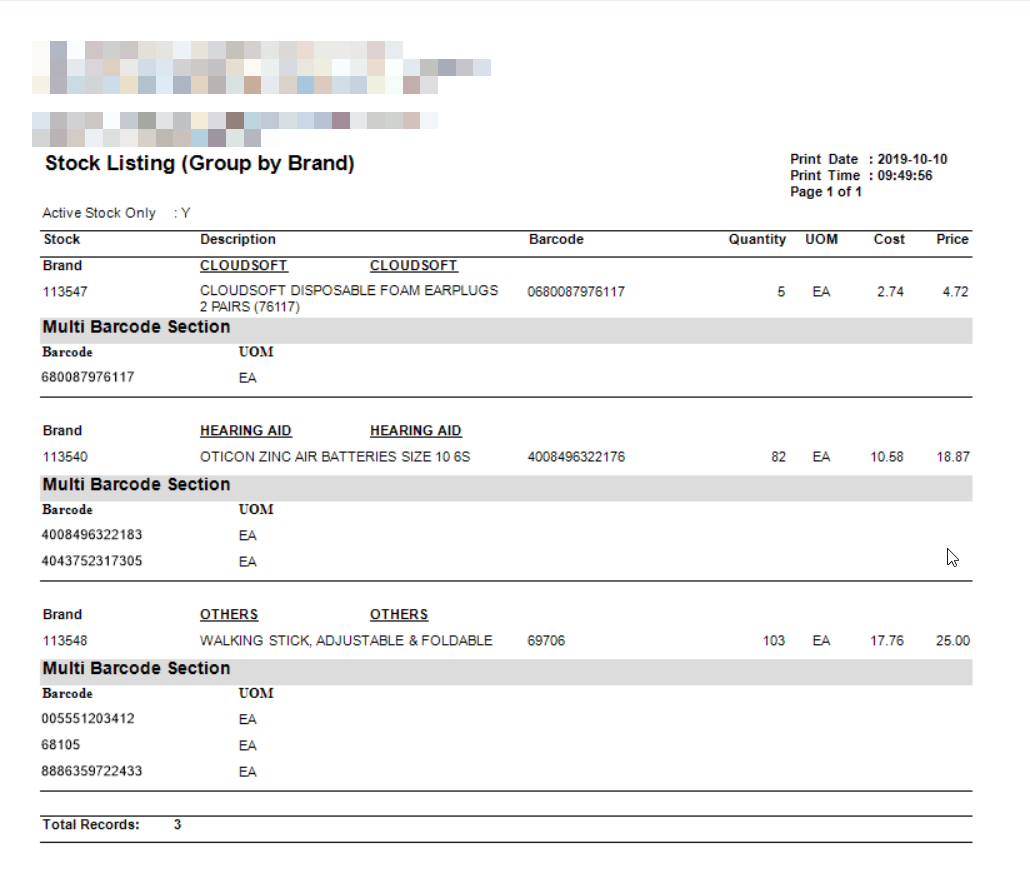 Notes: The report breakdown and summarized the figures by selected Grouping Option such as Brand/Group/Category/Color/Size/User Define Group 1/User Define Group 2/User Define Group 3 with tick the checkbox Include Multi-Barcode Records.