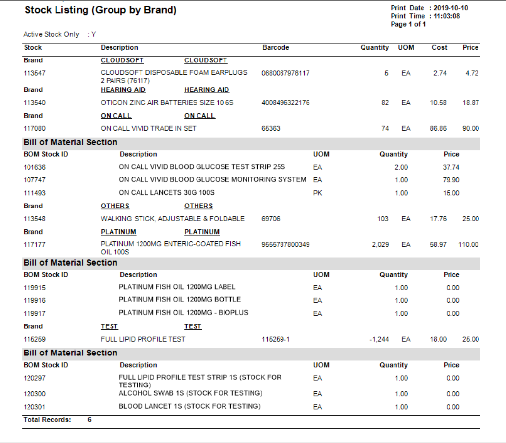 Notes: The report breakdown and summarized the figures by selected Grouping Option such as Brand/Group/Category/Color/Size/User Define Group 1/User Define Group 2/User Define Group 3 with tick the checkbox Include Bill of Material Records and Include Bill of Material Stock Only. This report only showing the stock that include bill of material and the other stock will not showing.