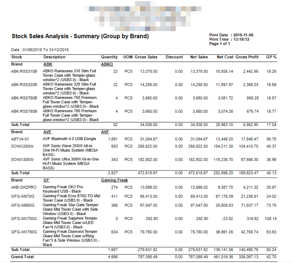 Notes: The report breakdown and summarized the figures by selected Grouping Option such as Brand/Group/Category/Color/Size/User Define Group 1/User Define Group 2/User Define Group 3/Customer/Salesman/Location/Document Date.