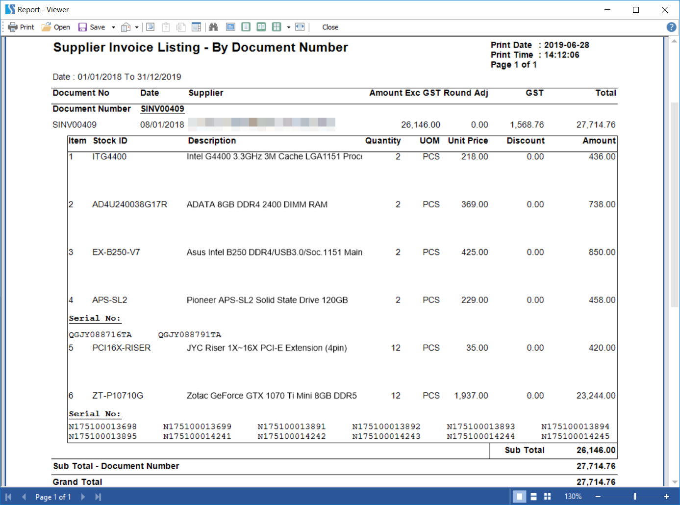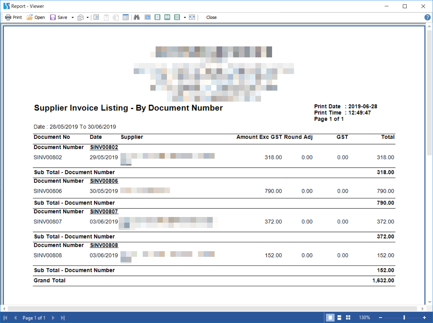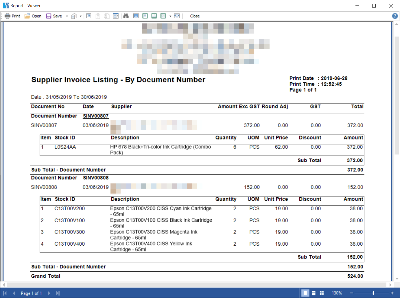 Notes: The report breakdown and summarized the figures by selected Grouping Option such as Document Number/Document Date/Supplier/Location.