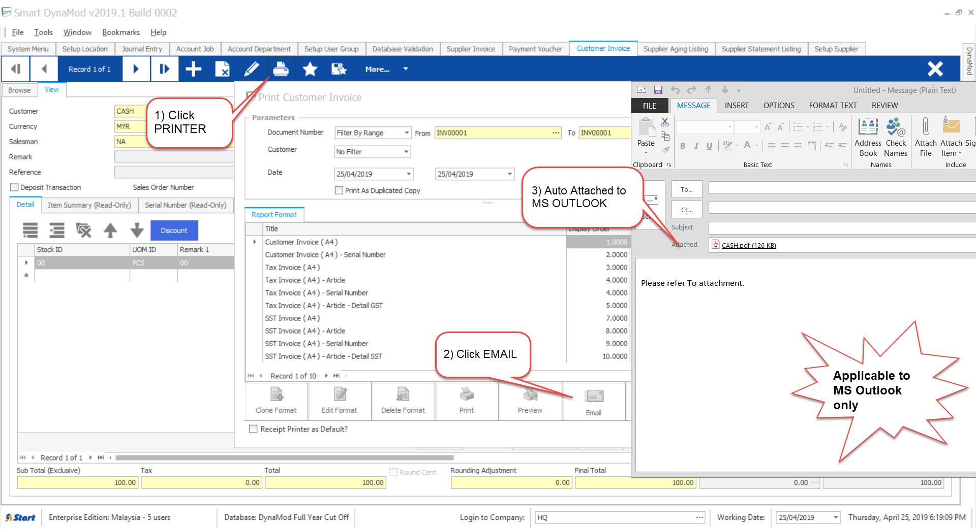Enhance sales and purchase cycle certain report able direct email without preview report. Affected report show as below:-