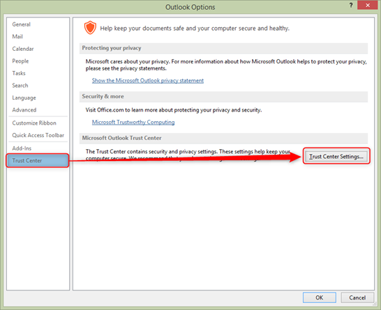 - In Outlook, select File > Options > Trust Center > Trust Center Settings, and then select Attachment Handling.